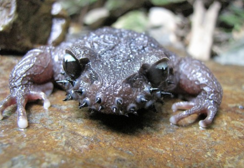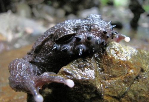 髭蟾,又稱中國(guó)角怪、胡子蛙,是中國(guó)南方的一種兩棲動(dòng)物,中國(guó)的特有物種。與其他蟾科動(dòng)物相比,髭蟾的蝌蚪期長(zhǎng),易遭天敵吞食,成活率低,所以髭蟾為世界級(jí)的珍稀動(dòng)物。雄性髭蟾每年發(fā)情期時(shí),上頜邊緣都會(huì)長(zhǎng)出8至11枚黑色角質(zhì)刺,此乃中國(guó)角怪的名稱由來,也被稱為“世界上長(zhǎng)有最多胡子的蛙”。