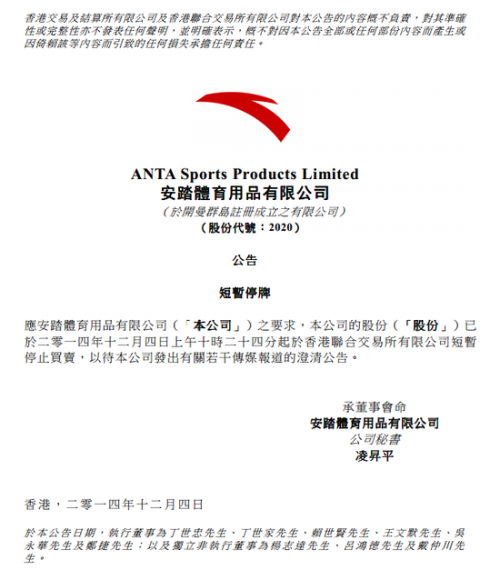 網易財經12月4日訊 安踏體育(02020-HK)今日發布公告,于10時24分起短暫停止買賣。公告稱,本公司的股份已于二零一四年十二月四日上午十時二十四分起于香港聯合交易所有限公司短暫停止買賣,以待本公司發出有關若干傳媒報道的澄清公告。