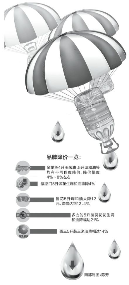 金龍魚與福臨門是國內主要的小包裝食用油品牌,金龍魚市場占有率在40%左右,福臨門市場占有率在15%左右,二者是國內食用油的風向標。在食用油巨頭的帶領下,其他品牌,如潤之家、多力等品牌也應聲“跳水”,且降幅更大。其中,潤之家5升裝一級大豆油從45.9元降至33.9元,降幅高達22.6%。多力的5升裝葵花花生調和油、西王5升裝玉米油降幅也分別達到21%、14%。超市食用油導購人員告訴南都記者,這一波降價潮大多從11月底、12月初開始,主要是12月初以來的常規酬賓降價,降價時間僅持續2周左右。