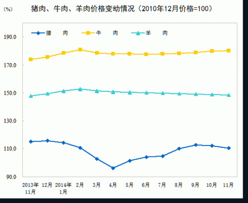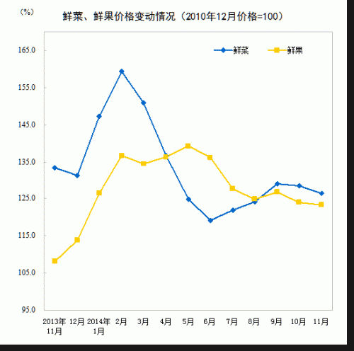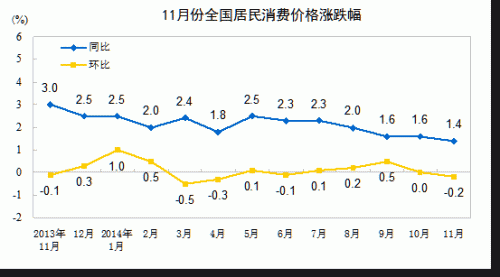 國(guó)家統(tǒng)計(jì)局今日發(fā)布11月經(jīng)濟(jì)數(shù)據(jù)顯示,2014年11月份,全國(guó)居民消費(fèi)價(jià)格總水平同比上漲1.4%。其中,城市上漲1.5%,農(nóng)村上漲1.3%;食品價(jià)格上漲2.3%,非食品價(jià)格上漲1.0%;消費(fèi)品價(jià)格上漲1.3%,服務(wù)價(jià)格上漲1.8%。1-11月平均,全國(guó)居民消費(fèi)價(jià)格總水平比去年同期上漲2.0%。