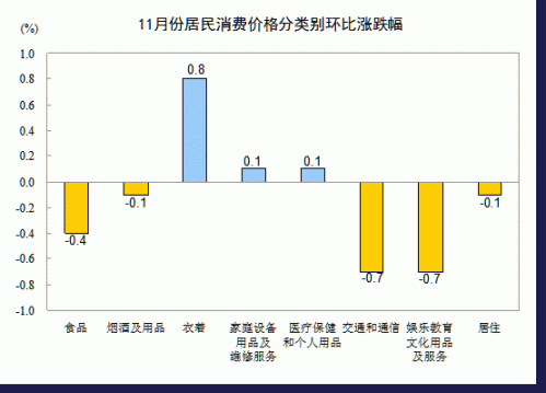 11月份,非食品價(jià)格環(huán)比下降0.1%。其中,交通和通信、娛樂教育文化用品及服務(wù)、煙酒及用品、居住價(jià)格分別下降0.7%、0.7%、0.1%和0.1%;衣著、家庭設(shè)備用品及維修服務(wù)、醫(yī)療保健和個(gè)人用品價(jià)格分別上漲0.8%、0.1%和0.1%。