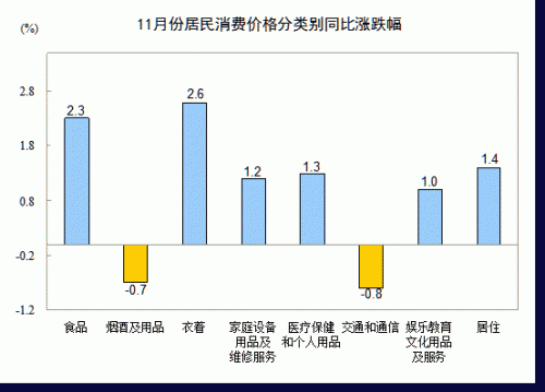 據(jù)測(cè)算,在11月份1.4%的居民消費(fèi)價(jià)格總水平同比漲幅中,去年價(jià)格上漲的翹尾因素約為0.3個(gè)百分點(diǎn),新漲價(jià)因素約為1.1個(gè)百分點(diǎn)。