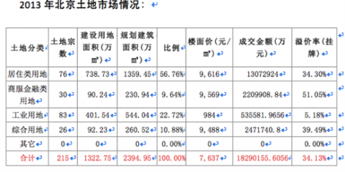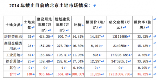 和歷年北京的賣地數據對比,北京的土地市場在2014年均創造了多項紀錄,其中總成交額,住宅成交額,均創記錄,特別是住宅土地的成交價格,平均樓面價高達14557元每平米,比2013年的9616元每平米上漲了51%。