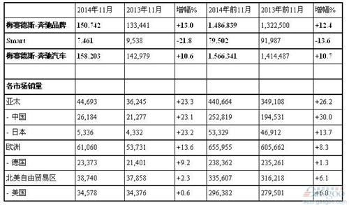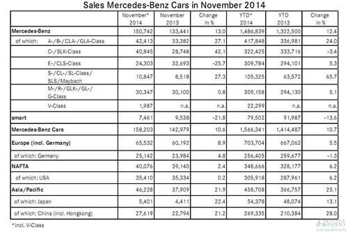 2014年11月份,梅賽德斯-奔馳品牌在全球銷售了150,742輛汽車,2013年11月奔馳全球交付銷量為133,441輛,今年同比增長13.0%。1到11月份,奔馳品牌在全球銷售了1,486,839輛汽車,較之去年同期的1,322,500輛,同比提升12.4%。