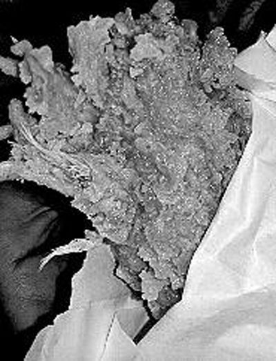 高女士說,12月10日下午6時許,她和朋友在這家肯德基餐廳等人,順便點了一份雞翅、一份薯條和一杯可樂。一份雞翅有兩個,高女士的朋友先吃了一個,沒有發現異常。當高女士拿起另外一個雞翅準備吃時,發現這個雞翅的“塊頭”要比平常的更大一些,雞翅上多出許多齒狀的東西。咬了一口后,看見里面有一個白色的條狀物,看起來很像雞毛。摳掉雞翅外面裹的面,高女士發現里面有一撮白毛,扯下來一看,果真是雞毛。讓高女士吃驚的是,這些雞毛不是很小的絨毛,而是比較粗的羽毛,長度有三四厘米。