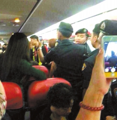 飛機(jī)降落后,泰國(guó)警方和地勤人員立即登機(jī),但并未立即采取強(qiáng)制措施。回到地面后,潑水的女乘客在候機(jī)廳長(zhǎng)椅上休息了約20分鐘,隨后四人被泰國(guó)警方帶走。