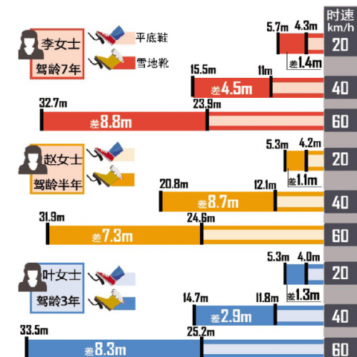 通過(guò)測(cè)試結(jié)果發(fā)現(xiàn),三名實(shí)驗(yàn)人員穿著雪地靴踩剎車(chē),制動(dòng)距離全部都比穿著平底鞋時(shí)增加了。