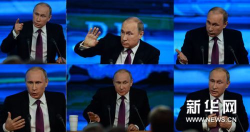 拼版照片顯示的是,近日,俄羅斯總統普京在莫斯科舉行的年度大型記者招待會上講話。新華社記者 賈宇辰攝