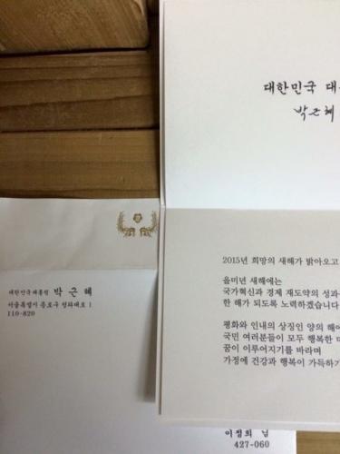 樸槿惠向各界人士送賀年卡 封面印刺繡作品照片 2014-12-24 06:58 0 在新年到來之際,韓國總統樸槿惠向社會領導層和各界人士送出了賀年卡。 據青瓦臺透露,賀年卡從19日起送出,封面上印著樸槿惠親自刺繡的作品照片。 中新網12月23日電 據韓媒報道,近日,在新年到來之際,韓國總統樸槿惠向社會領導層和各界人士送出了賀年卡。 據報道,賀年卡內頁寫著“2015年充滿希望的新年即將來到,在象征和平與忍耐的羊年,希望所有國民都能夠設計出自己幸福的未來、實現自己的夢想,愿各位的家庭健康并充滿幸福”。 據青瓦臺透露,賀年卡從19日起送出,封面上印著樸槿惠親自刺繡的作品照片。