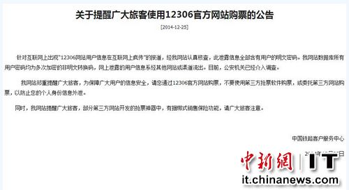 針對用戶信息泄露一事,12306官方網站隨即發布公告稱,經過調查,此次泄露信息全部含有用戶的明文密碼,并稱12306網站數據庫所有用戶密碼均為多次加密的非明文轉換碼,網上泄露的用戶信息系經其他網站渠道流出。目前公安機關已經介入調查。(中新網IT頻道)