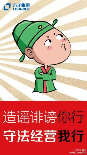 12月26日凌晨,方正集團發布卡通版本微博回應政泉,每張卡通圖片上附上文字說明,主要文字內容包括“勸君自重”、“北大方正總資產狀況”、“造謠誹謗你行,守法經營我行”、“恐嚇陷害你行,為國為民我行”、“尋釁滋事你行,方正持重我行”、“方方正正做人,實實在在做事”等。