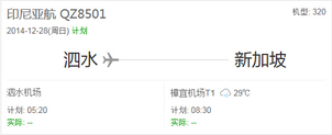 馬來西亞亞航一架客機失聯 型號為空客A320 2014-12-28 11:44 0 圖為航班信息 圖為失聯客機 圖為氣象航圖 據央視消息,亞洲航空一架從印尼飛往新加坡的客機失聯。 路透社報道,印尼媒體援引交通部官員說法稱,印尼泗水飛往新加坡的亞航QZ8501航班與雅加達塔臺失聯,失聯時間是北京時間今日7時17分。據航班追蹤網站信息查詢,該機型為A320。 當地民航官員稱,飛機在失聯前,被空管要求繞行“非常規路線”。