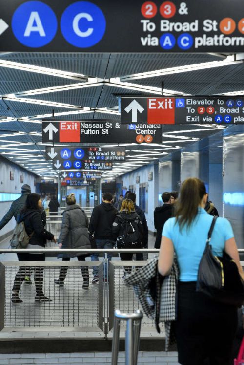 12月16日,乘客在美國紐約曼哈頓新建成的富爾頓地鐵換乘中心中央大廳換乘。 紐約市捷運局推出的地鐵票證系統MetroCard將車票劃分為單次票、月票和儲值票等類型。其中單次票價為2.75美元,持Metro Card搭乘地鐵可于2小時內免費轉乘一次室內公共汽車。月票價格為112美元,周票價格為30美元,有效期內均可無限次乘車。儲值卡充值可得到優惠,例如充值30美元,卡中會顯示已儲值31.5美元,多出來的1.5美元不能取現,只能留在卡中。