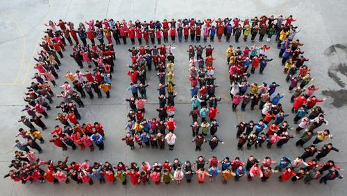 2014年12月31日,在山東省煙臺(tái)市崇文學(xué)校,學(xué)生擺出“2015”造型,迎接新年。