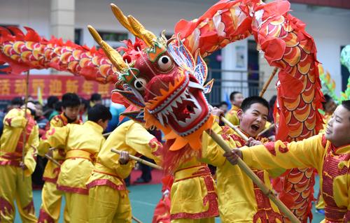 2014年12月31日,合肥市瑤海區(qū)少兒藝術(shù)學(xué)校的小學(xué)生在校園里進(jìn)行傳統(tǒng)舞龍表演,迎接新年的到來。