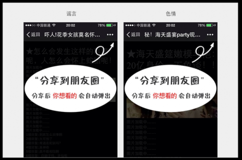 微信整頓誘導分享行為 兩次違規永久封號 2015-01-01 08:42 相欣 0 近日,微信公眾平臺發布公告稱,將整頓朋友圈內部分商家通過外鏈進行誘導分享以及誘導關注的行為。主要內容如下: 1. 誘導分享:發送謠言、色情、測試類、答題類等內容誘導用戶分享至朋友圈,分享后用戶才可見到答案或內容。 2. 誘導關注:發送謠言、色情、測試類、答題類等內容誘導用戶關注公眾號,關注后用戶才可見到答案或內容。 微信稱,第一次違規受到的處罰包括封號30天、攔截鏈接、刪除誘導增加的粉絲、關閉流量主。第二次違規則將被永久封號。 以下是違規示例: 1. 誘導分享: 2. 誘導關注: