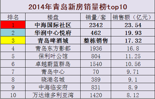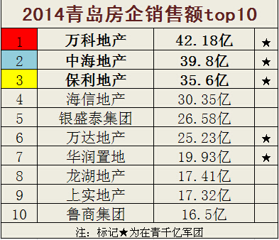 根據青島新聞網房產頻道統計,在2014青島房企銷售前十強的榜單,外來大鱷和本地房企均在氤氳的樓市氛圍之中均有良好表現。