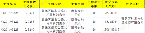根據成交公示顯示,編號HD2014-3226位于黃島區濱海公路北、柏果樹河東側,土地面積為0.0371公頃,土地用途為商務金融,出讓年限40年,成交總價為76.06984萬元;編號HD2014-3227位于黃島區濱海公路北、柏果樹河東側,土地面積為0.0283公頃,土地用途為商務金融,出讓年限40年,成交總價為58.15084萬元;編號HD2014-3228位于黃島區濱海公路北、柏果樹河西側,土地面積為0.8249公頃,土地用途為商務金融,出讓年限40年,成交總價為1596.833171萬元。三幅地塊的總占地面積為8903㎡,總成交金額約1731萬元。