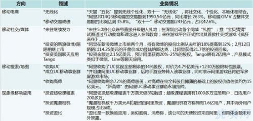 如果細數投資數量,2014年阿里在移動領域投資案例少于前兩年,最大手筆投入在UC和高德的兩次全資收購上,兩者并入阿里后成立新的移動事業群區別于此前阿里無線事業,移動事業群偏向移動(端)入口的布局。