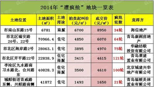 除了單價最高的,就是最受歡迎的。2014年青島不少地塊因為地理位置優越、起拍價格適中而備受各家房企歡迎,甚至上演了一些瘋狂的“搶地大戰”。根據記者整理,2014年青島共有6幅重點地塊遭到了房企們輪番哄搶,最高紀錄是被多家開發商輪番叫價121輪。
