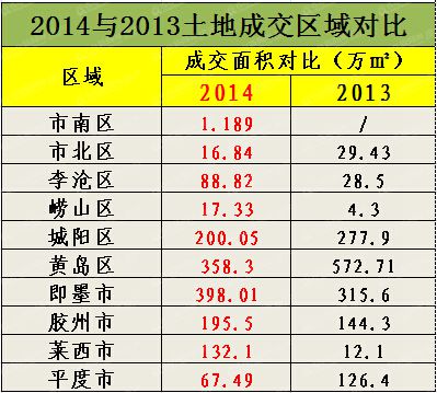 不過與2013年相比,2014年主城區地塊成交量大大增加,市內四區共出讓土地124.179萬㎡,比2013年的62.23萬㎡整整多出2倍。市南區打破“0成交”的尷尬局面,賣地1.189萬㎡。市北區成交面積從2013年的29.43萬㎡銳減到16.84萬㎡,而李滄區則成相反態勢,土地成交面積猛增至88.82萬㎡,比2013年翻了3番;嶗山區土地成交也有所上漲,2014年土地成交面積17.33萬㎡,環比2013年4.3萬平方米的土地,整整漲了4倍之多。