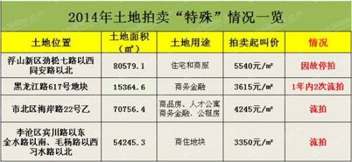回顧這一年,還有三宗地塊慘遭流拍。黑龍江617號地塊命運多舛,經歷了4次登臺、4次流拍的慘狀。值得一提的是,僅在2014年,該地塊分別在年初、年尾兩次拍賣,也兩次“降價求成交”,但是仍無人買賬;市北區海岸路22號乙地塊土地面積較大,土地用途多種多樣,起拍價4245元/㎡并不高,但臨要上市拍賣卻被“因故取消”,這讓關注的市民們唏噓不已。另外,東李世園片區內賓川路東、金水路南的一宗地塊也經歷了流拍的尷尬局面,據悉該地塊是伴隨著同一位置的其他三家地塊一起登臺“找婆家”的,但是眼看著其他3幅地塊被大鱷巨頭萬科打包收入囊中,唯獨這幅含有大面積商業的地塊被拒之門外。