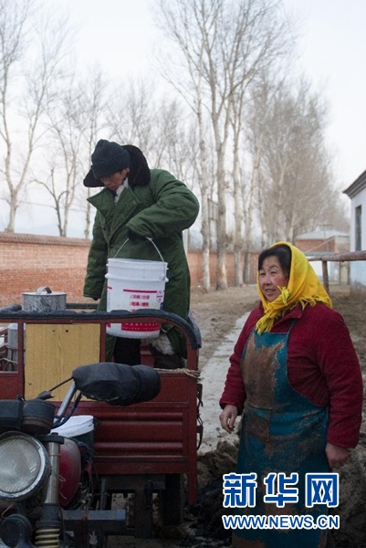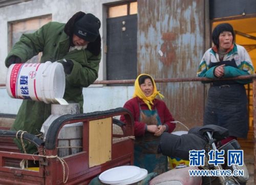 1月10日,在北京市延慶縣大榆樹下辛莊村村頭奶站,工作人員在將一桶鮮奶出售。新華社記者羅曉光攝