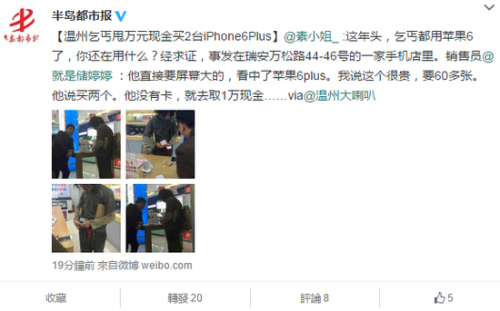 【溫州乞丐甩萬元現金買2臺iPhone6Plus】@素小姐_ :這年頭,乞丐都用蘋果6了,你還在用什么?經求證,事發在瑞安萬松路44-46號的一家手機店里。銷售員@就是儲婷婷 :他直接要屏幕大的,看中了蘋果6plus。我說這個很貴,要60多張。他說買兩個。他沒有卡,就去取1萬現金