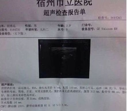 男孩點點今年1周歲,由于連續高燒,家人將其送到安徽宿州市立醫院,經過醫生檢查,發現點點腹部有點脹,懷疑有腸套疊,建議給孩子做彩超。很快,點點爸拿到腹部超聲檢查的報告單,但報告單上的檢查結論,讓他當場傻了眼:報告單上寫孩子宮腔內掃見一活動嬰兒,還寫了羊水、胎盤等。