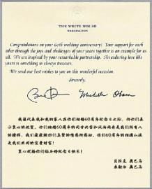印有白宮標志的賀卡上,貝克爾·奧巴馬及夫人米歇爾·奧巴馬的親筆簽名十分醒目。“我謹代表我和我的家人在你們結婚60周年紀念日之際,向你們表示衷心的祝賀,你們結婚60周年的同甘共苦和風雨同舟是我們所有人的榜樣,我們深深被你們真摯的情感所感動。你們60周年的相濡以沫是我們共同的寶貴財富!衷心祝福你們鉆石婚紀念日快樂!”