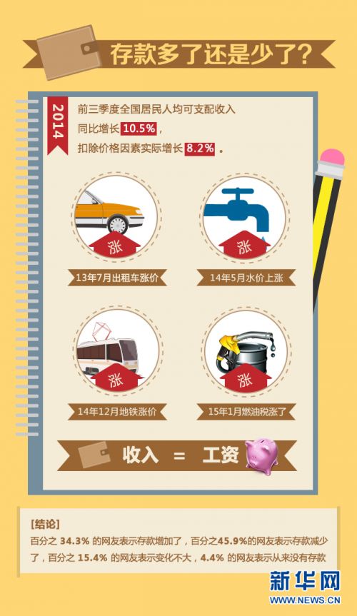 除去收入的漲與否,一些支出的變化也得好好算一筆。地鐵告別2元時(shí)代,新一年的公共交通成本著實(shí)增加不少。油價(jià)一路走熊,私家車主們或可省去一筆銀子。整體走低的房?jī)r(jià),在2015年的走勢(shì)仍然是個(gè)迷。有單獨(dú)二孩誕生的家庭,或?qū)⒚媾R巨大的開支壓力。調(diào)查顯示,34.3%的網(wǎng)友表示2014年的儲(chǔ)蓄有所增加,15.4%的網(wǎng)友認(rèn)為存款變化不大,而45.9%的網(wǎng)友則表示存款有所減少,4.4%的網(wǎng)友無(wú)奈表示從來(lái)就沒(méi)有存款。網(wǎng)友預(yù)測(cè),房?jī)r(jià)的波動(dòng)、交通成本的提升、子女教育成本的提高將是影響他們2015年“錢景”的主要開支因素。