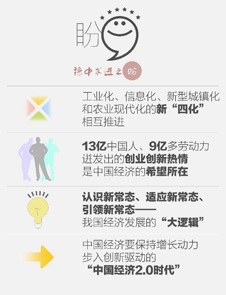 盼,意為期待、盼望。中國經濟擁有巨大的韌性、潛力和回旋余地,2015年仍然有望保持平穩較快的發展。此謂穩中求進之“盼”。