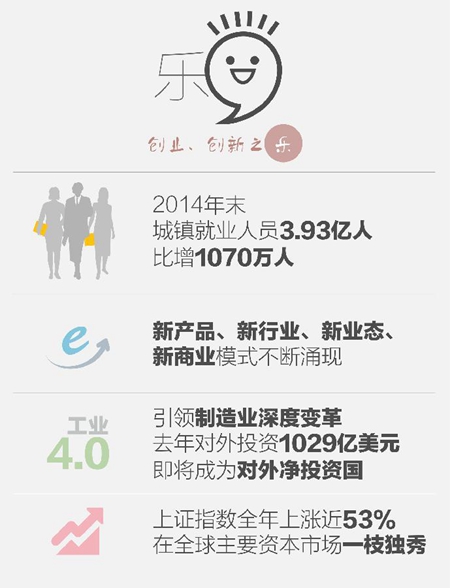 樂,意為快樂。統計局數據顯示,2014年雖然經濟下行壓力加大,但就業不降反增,更掀起一波創業創新的浪潮。新常態下,中國城鄉區域差距逐步縮小,居民收入占比上升,發展成果惠及更廣大民眾。新常態下,中國經濟從要素驅動、投資驅動轉向創新驅動、消費驅動。此謂創業創新之“樂”。