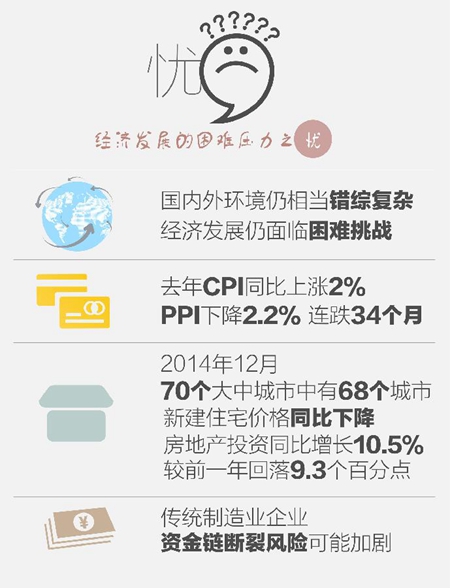 憂,即擔憂、隱憂。2014年,中國經濟遭遇諸多挑戰和困難,包括樓市低迷、地方債務高企、工業產能過剩等,可謂經濟發展的困難壓力之“憂”。