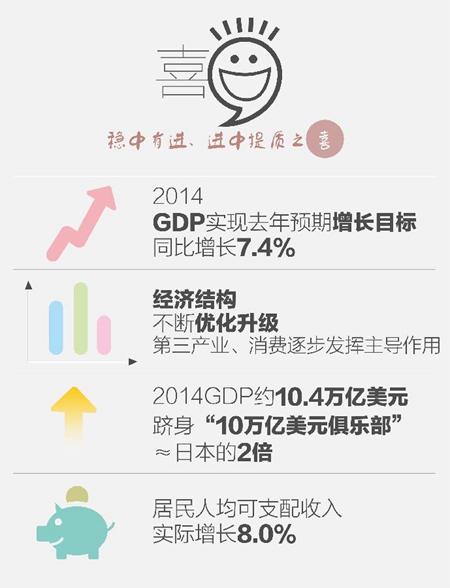 喜,即是高興。馬建堂說,2014年,國民經濟在新常態下保持平穩運行,呈現出增長平穩、結構優化、質量提升、民生改善的良好態勢?;蛟S,就可以稱其為穩中有進、進中提質之“喜”。