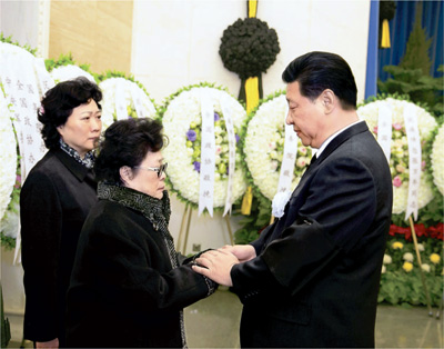 上午9時許,習近平、張德江、俞正聲、劉云山、王岐山、張高麗等,在哀樂聲中緩步來到張萬年同志的遺體前肅立默哀,向張萬年同志的遺體三鞠躬,并與親屬一一握手,表示慰問。