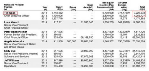 【TechWeb報道】1月23日消息,據美國證券交易委員會(SEC)文件顯示,蘋果公司首席執行官蒂姆-庫克(Tim Cook)2014年的薪資為920萬美元,相比其2013年的425萬美元的薪酬,整整翻了一番。而該文件還透露了其他蘋果高管的薪資,包括首席財務官Luca Maestri、零售及在線商店副總裁安吉拉·阿倫茨(Angela Ahrendts)等。