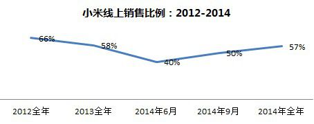 根據賽諾公司及其高層公開發布的數據,我們不難繪制小米的線上銷售比例變化圖。從小米手機發展來看,起家于線上,借力線下渠道與運營商渠道實現了規模突破,業內所熟知的線下線上的三七、四六比例。而在2014年6月,小米再次加大線上銷售力度,以至于2014年全年統計回到2013年的比重。