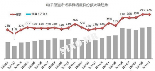 線上已從屌絲到三分天下有其一。根據賽諾公開報告,2014年國內市場線上份額大約在20%,超過8000萬部。2015年國內市場總體銷量規模增長率將低于5%,按線上市場份額將有望達到25%上下,總量達1億部左右。從發展趨勢角度,運營商渠道、線下公開渠道、線上渠道= 3:4:3的格局,三分天下有其一。