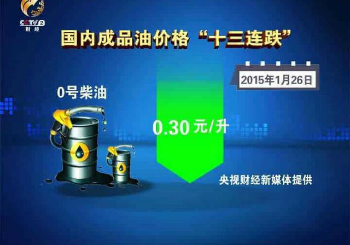 從2014年7月22號(hào)油價(jià)第一次下調(diào)起,“十三連跌”已致成品油每升累計(jì)下調(diào):汽油2.03元,柴油2.4元。以此計(jì)算,50升油箱的私家車,加滿一箱油能省100元。受全球石油供應(yīng)過剩及能源需求前景悲觀的影響,自2014年下半年以來,國際原油價(jià)格遭遇“腰斬”。進(jìn)入2015年,在對(duì)供需格局持續(xù)悲觀的預(yù)期下,紐約商品交易所輕質(zhì)原油期貨價(jià)格和倫敦布倫特原油期貨價(jià)格均已跌破每桶50美元。截至目前,相比2014年6月的原油價(jià)格峰值,歐美原油價(jià)格均暴跌近六成。