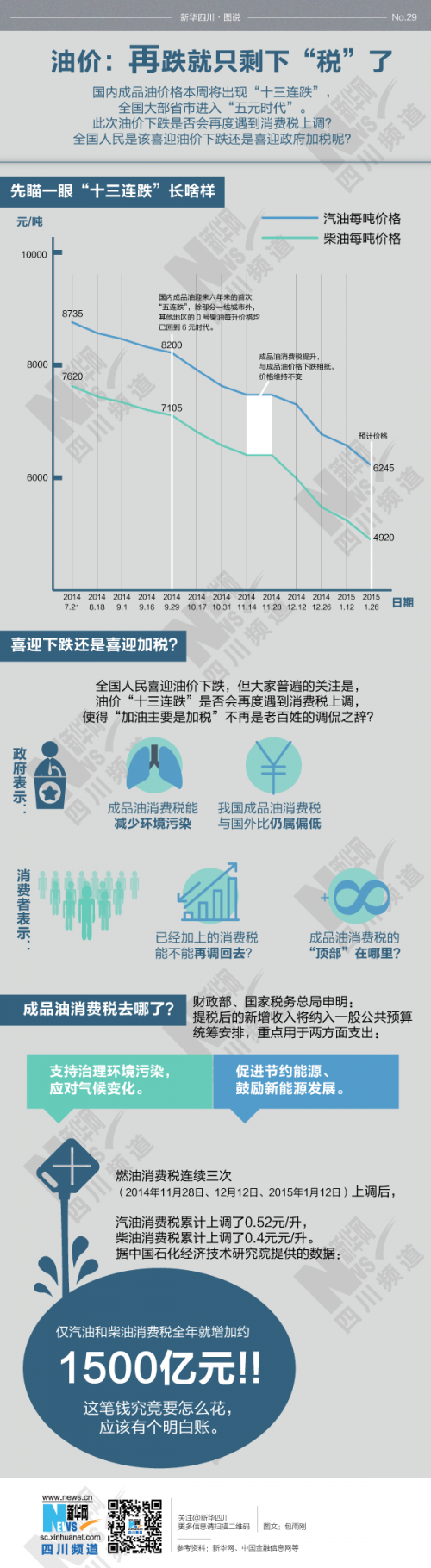 發展改革委稱,1月中旬以來,受全球石油市場供應充裕、需求乏力等因素影響,國際市場油價震蕩下行,前10個工作日平均價格繼續回落。這是2014年7月以來連續第13次下調汽、柴油價格。此次下調后,全國大部分省市93號汽油、北京的92號汽油每升價格將回到“5元時代”。