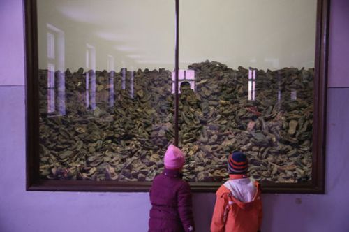 參觀集中營(yíng)的兒童站在一處展柜前,里面的物品是集中營(yíng)的兒童囚犯留下的鞋子。