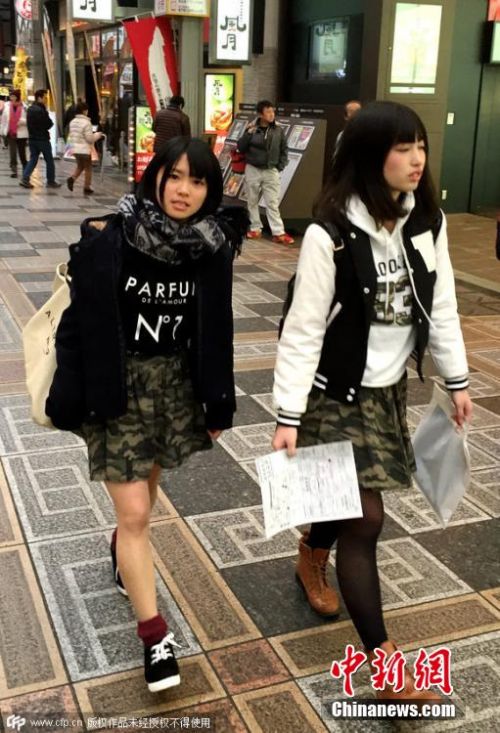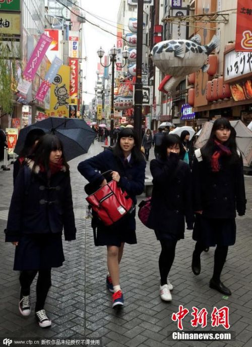 2015年1月27日消息,日本大阪,當地氣溫接近0攝氏度,記者先后來到大阪市難波地區、梅田地區和京都,發現從十幾歲的初中生到工作的白領,幾乎都身穿著大衣,下身穿著超短裙,有的穿著長筒襪,有的則直接赤腳。尤其在新北野中學門前看到,初中生清一色的短裙校服、白色長襪。記者實地了解發現,除了電車和地鐵的座椅下有暖風送出外,戶外和室內并沒有特殊的供暖設施,商場、餐廳內供暖溫度還有中國國內同場所溫度高,日本女性冬季穿短裙除了歷史原因、傳統風俗,主要是從小開始的耐寒鍛煉,增加了女性自身耐寒忍受力。圖片來源:CFP視覺中國