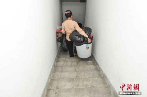 王書偉在樓梯間里的清理住戶的生活垃圾,最重的時候一桶垃圾重達八十斤。她白天在一家物業公司上班,每天負責小區一棟32層住宅樓的清潔衛生,每個月能為她帶來1650元的收入。中新社發 陳驥旻 攝