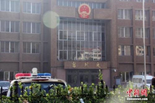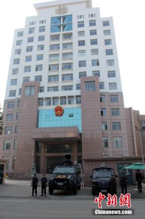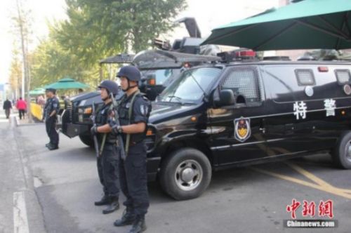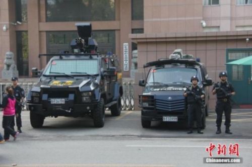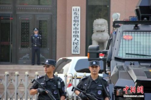 10月11日上午,備受關注的山東招遠“麥當勞殺人案”在山東省煙臺市中級人民法院第一審判庭公開宣判。法庭外戒備森嚴,數輛特警車停在法院門前及道路兩邊,手持槍支、身著特警服裝的防暴警察在現場執勤,周圍還聚集了不少手持攝像機和相機的記者。中新社發楊兵 攝