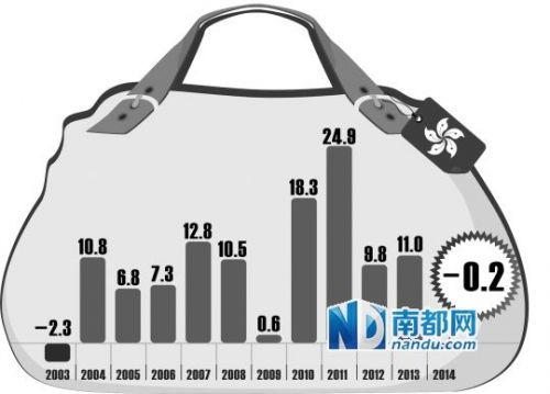 港府前日公布最新零售業(yè)銷(xiāo)貨額數(shù)據(jù),2014年全年香港的零售業(yè)總銷(xiāo)貨價(jià)值為4933億港元,較2013年全年下跌0.2%,而總銷(xiāo)貨數(shù)量則上升0.6%。翻查港府統(tǒng)計(jì)處有關(guān)數(shù)據(jù),最近一次零售業(yè)總銷(xiāo)貨價(jià)值下跌要追溯到2003年,2003年較2002年下跌2.3%,背景則是當(dāng)年因SARS事件導(dǎo)致香港社會(huì)、經(jīng)濟(jì)遭遇創(chuàng)傷,也就在2003年的下半年,內(nèi)地推出赴港澳的自由行政策,后來(lái)逐步拓展至更多城市。