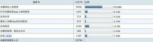 一個有趣的事實是,已經使用“豆瓣”App 的用戶中,近六成是通過豆瓣網站知道它的,而通過豆瓣其他應用和分發渠道的用戶只有不到1/4。