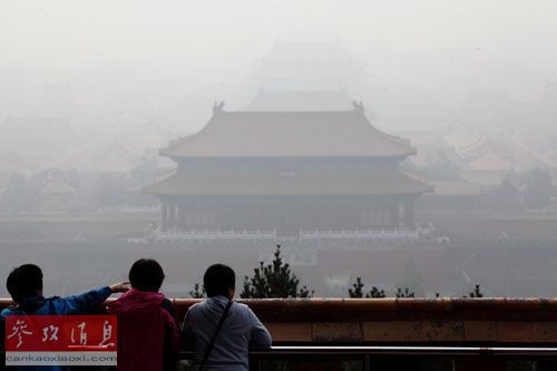 資料圖:10月25日,游人在霧霾籠罩的北京景山上眺望故宮。新華社發王希寶 攝