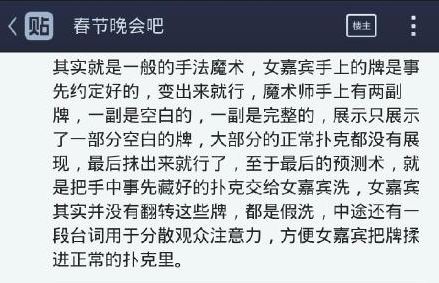 然而,紙牌魔術雖然表演的天衣無縫,但是魔術節目結束后,仍有網友進行揭秘。據“春節晚會”貼吧網友爆料,此魔術就是一般的手法魔術,女嘉賓手上的牌是事先約定好的,變出來就行,魔術師手上有兩副牌,一副是空白的,一副是完整的,只是展示了一部分空白的牌,大部分正常的撲克都沒有展現,最后抹出來就行了,至于最后的預測術,就是把手中事先藏好的撲克交給女嘉賓洗,女嘉賓其實并沒有反轉這些牌,都是假洗,中途還有一段臺詞用于分散觀眾注意力,方便女嘉賓把牌揉到正常的撲克里。