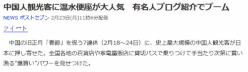 另據觀察者網查詢,日本NEWS postseven在23日也報道了同一現象,稱因為中國春節七天連休,日本迎來了史上最大規模的中國觀光客。中國人通過包車等方式各處搜購全日本各地的百貨店和家電店,購買力強大。秋葉原的家電店店員稱:“還有一次購買3至4臺的中國游客,大概一個小時會賣50臺(溫水洗凈馬桶),一天要從廠商那里進貨非常多次。”